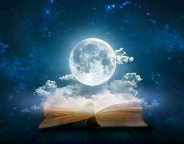 Full moon above open pages of old book; Astrology, zodiac, esoteric concept